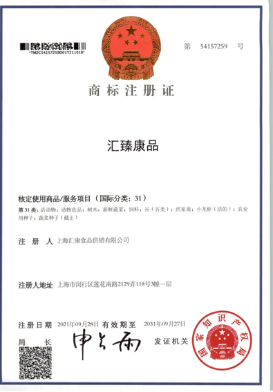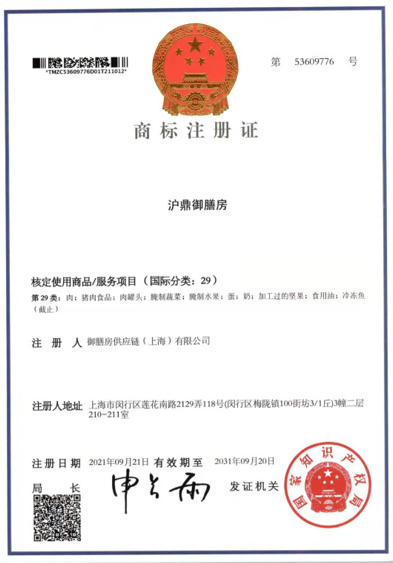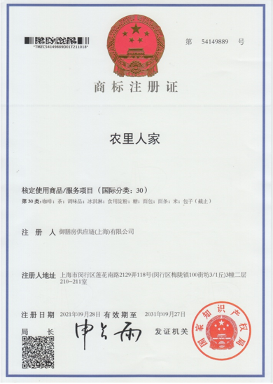 汇康食品集团近日荣获农里人家、汇臻康品、沪鼎御膳房等商标注册证书,其中旗下御膳房供应链(上海)有限公司“农里人家”核定使用商品/服务项目(国际分类30):咖啡;茶;调味品;冰淇淋;食用淀粉;糖;面包;面条;米;包子。沪鼎御膳房核定使用商品/服务项目(国际分类29):肉;猪肉食品;肉罐头;腌制蔬菜、腌制水果;蛋;奶;加工过的坚果;食用油;冷冻鱼。沪鼎御膳房(国际分类31):活动物;动物食品;树木;新鲜蔬菜;饲料;新鲜水果;谷(谷类);活家禽;小龙虾(活的);农业用种子。上海汇康食品供销有限公司“汇臻康品”核定使用商品/服务项目(国际分类31):活动物;动物食品;树木;新鲜蔬菜;饲料;谷(谷类);活家禽;小龙虾(活的);农业用种子;蔬菜种子。